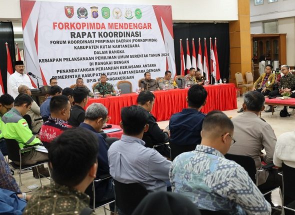 Saskindo Media, Tenggarong – Bupati Kutai Kartanegara (Kukar) Edi Damansyah memimpin rapat koordinasisa (Rakor) Forum Koordinasi Pimpinan Daerah (Forkopimda) Kabupaten Kukar dalam rangka kesiapan pelaksanaan Pemilihan Umum (Pemilu) serentak tahun 2024, yang dirangkai penandatanganan Perjanjian Kerjasama antara BPJS Ketenagakerjaan, di ruang serbaguna Batara Agung Dewa Sakti Kantor Bupati Kukar, Kamis (1/2/2024).