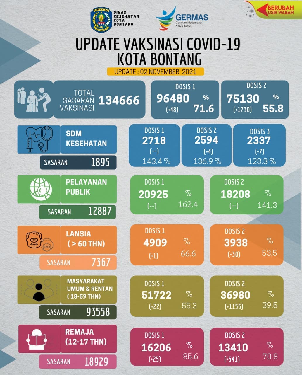 Berdasarkan data dari dinas kesehatan Kota Bontang capaian vaksinasi usia remaja atau pelajar di Kota Bontang menunjukkan kemajuan yang baik karena jumlahnya terus meningkat. Per 2 Nopember 2021, sebanyak 16.206 orang telah divaksin tahap pertama, dengan persentase sebesar 85,6% dari target 18.929 orang.