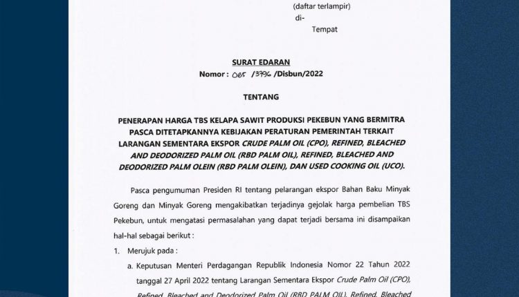Hal itu berdasarkan surat Keputusan Menteri Perdagangan Republik Indonesia Nomor 22 Tahun 2022 tanggal 27 April 2022 tentang Larangan Sementara Ekspor Crude Palm Oil (CPO), Refined, Bleached and Deodorized Palm Oil (RBD PALM OIL), Refined, Bleached and Deodorized Palm Olein (RBD PALM OLEIN), dan Used Cooking Oil (UCO).