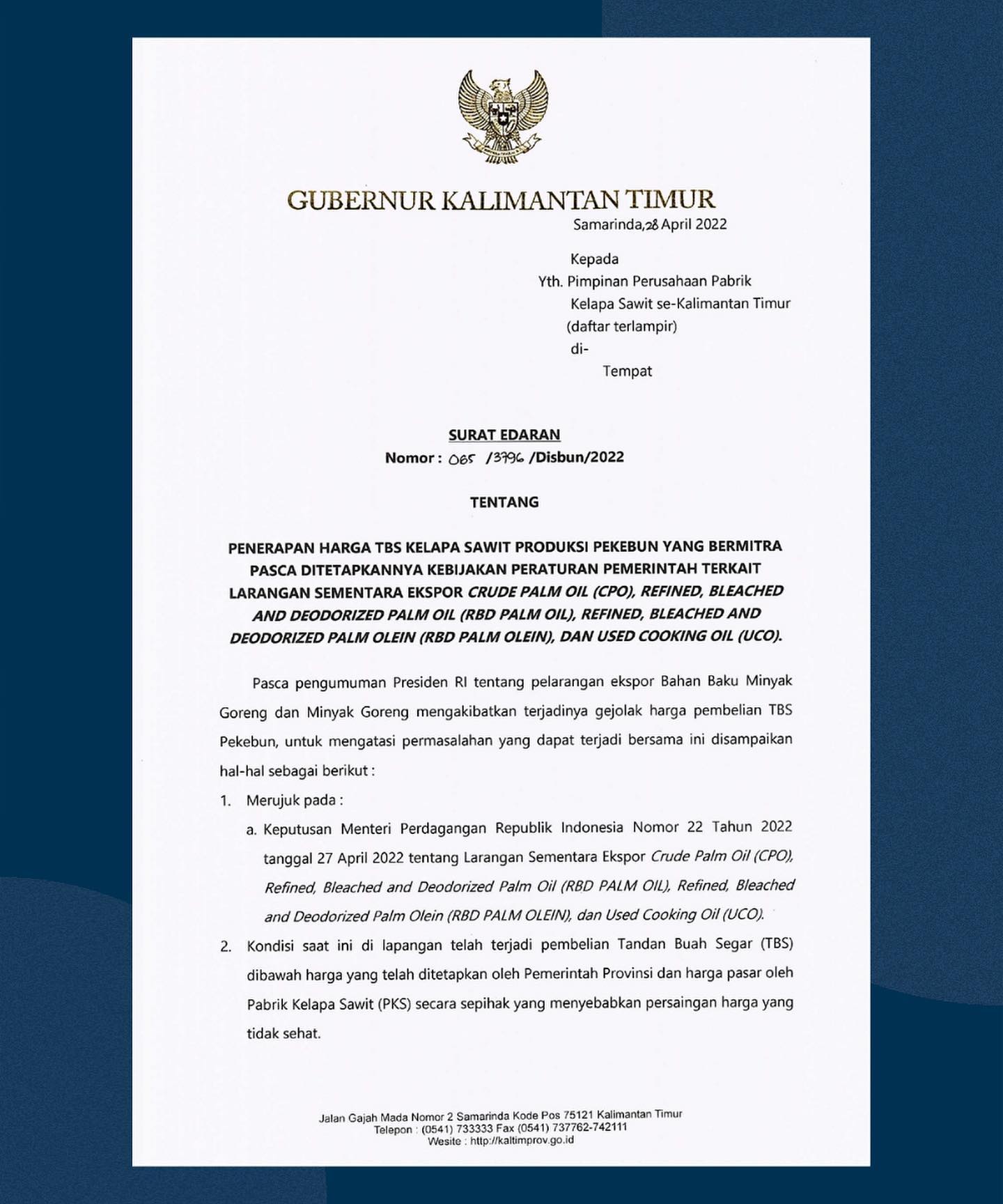 Kepedulian terhadap pekebun kelapa sawit, Pemprov Kaltim menerbitkan Surat Edaran (SE) Gubernur Kaltim yang ditandatangani Gubernur Isran Noor, tertanggal 28 April 2022, bernomor 065 /3794/Disbun/2022 tentang penerapan harga TBS kelapa sawit produksi pekebun yang bermitra pasca ditetapkannya kebijakan Peraturan Pemerintah terkait larangan sementara ekspor crude palm oil (CPO), refined, bleached and deodorized palm oil (RDBL), refined, bleached and deodorized palm olein (RBD palm olein) dan used cooking oil (UCO).