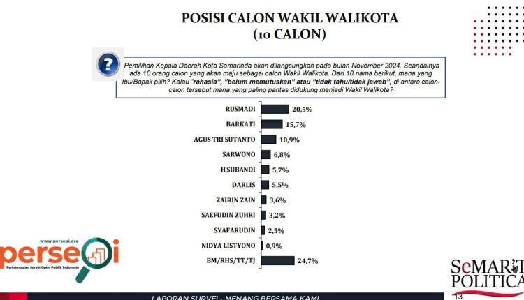 Saskindo Media, Samarinda – Lembaga survei dan konsultan politik, SeMAR’T POLITICA merilis survei terbaru elektabilitas calon terkuat Kandidat Wali Kota dan Wakil Wali Kota dalam perhelatan pemilihan kepada daerah (Pilkada) Kota Samarinda 2024.