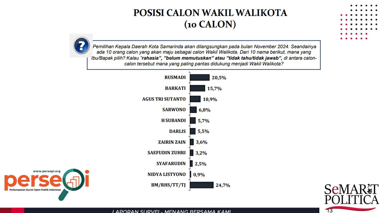 Hasilnya, dari 7 (tujuh) nama Calon Wali Kota yang ditanyakan kepada responden, 4 (empat) calon terkuat kandidat Wali Kota adalah Andi Harun 86,4 %, Barkati 2,7 %, Rusmadi 1,8 % dan Agus Tri Sutanto 1,6 %.