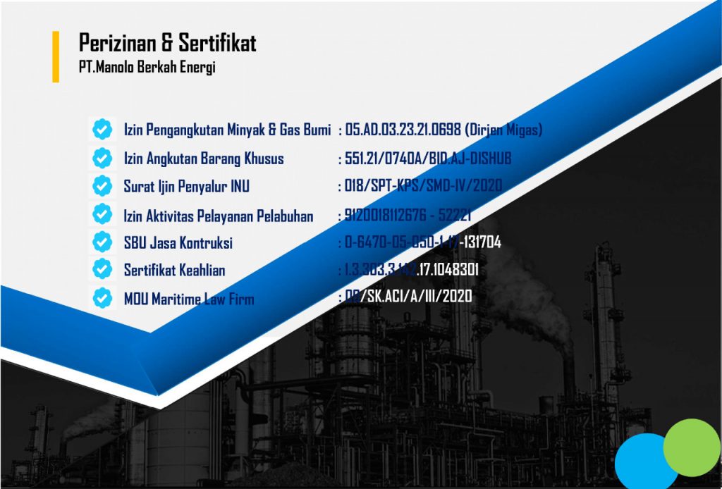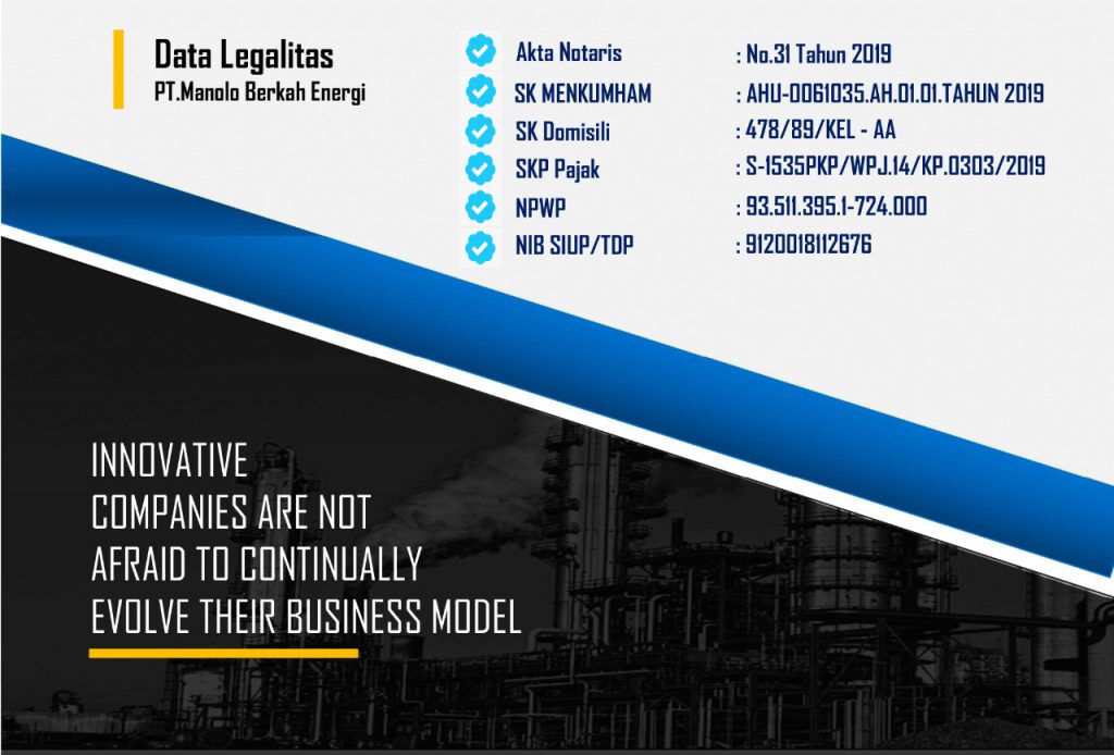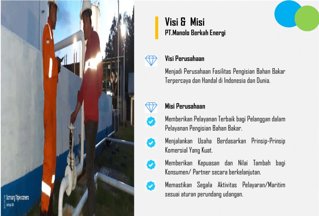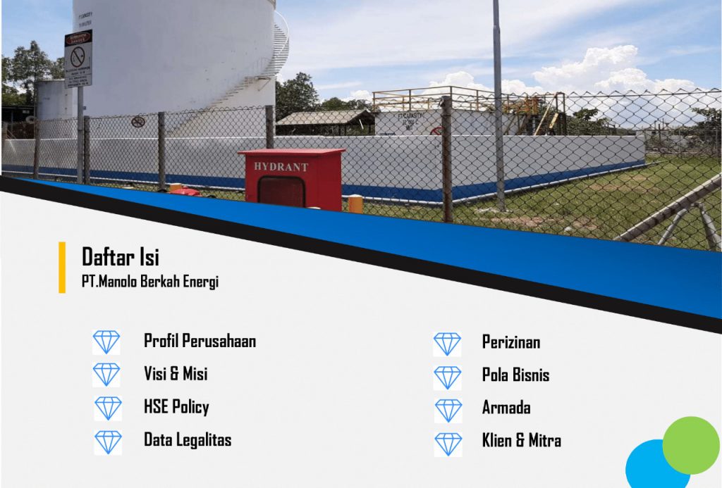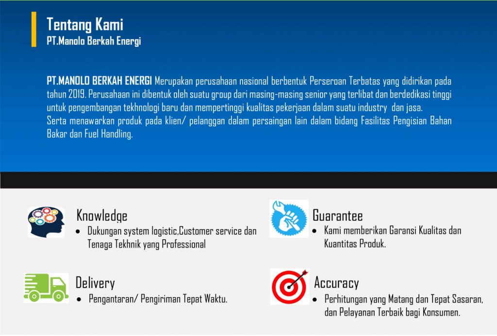 PT. Manolo Berkah Energi Adalah Perusahaan yang Focus di bidang Penyediaan dan Operator Fasilitas Pengisian Bahan Bakar dan Fuel & Handling. kami adalah perusahaan Nasional berbentuk perseroan terbatas yang didirikan pada tahun 2019. perusahaan kami berdedikasi tinggi untuk pengembangan teknologi dengan kualitas pekerjaan dalam suatu industri dan jasa.
