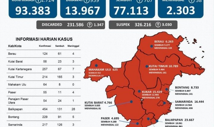 kasus yang telah dinyatakan sembuh sebanyak 77.113 kasus,” kata Andi Muhammad Ishak. Andi menambahkan untuk kasus meninggal dunia juga mengalami penambahan sebanyak 58 kasus dengan rincian di Berau 4 kasus, Kutai Barat 3 kasus, Kutai Kartanegara 7 kasus, Kutai.