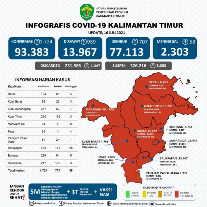 Saskindo Media – Satgas Penanganan Covid-19 Kalimantan Timur (Kaltim) menyebut tambahan kasus harian pada Jumat (16/7/2021) bertambah 1.724 kasus. Kondisi tersebut menjadi rekor baru ledakan kasus harian Covid-19 di Provinsi Kaltim.