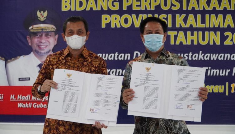 Kesepakatan bersama ditandatangani oleh Kepala Perpusnas RI Muhammad Syarif Bando dan Wakil Gubernur Kaltim, Hadi Mulyadi pada Rakornis Bidang Perpustakaan dan Kearsipan Kaltim Tahun 2022 di Pratasaba Resort Maratua, Selasa (16/3/2022).