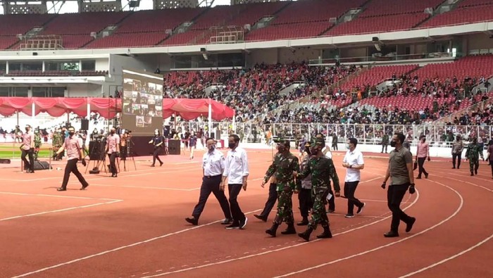 Jokowi didampingi Anies, Panglima TNI, dan Kapolri langsung berjalan ke tenda vaksinasi. Jokowi tampak meninjau peserta vaksinasi dan tenaga kesehatan (nakes) yang bertugas.