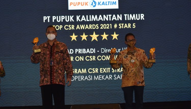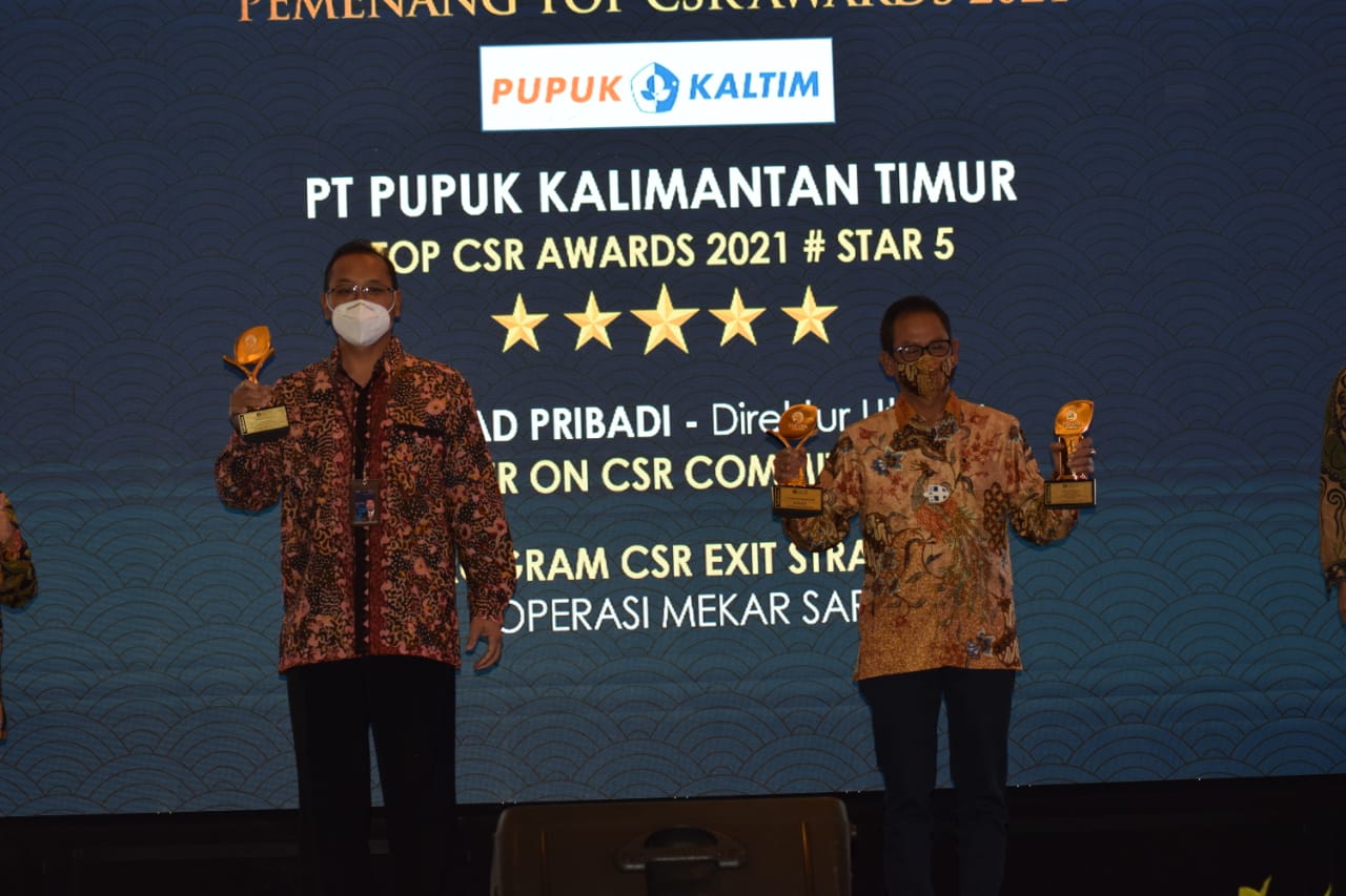 Saskindo Media – Pupuk Kaltim meraih 3 kategori penghargaan TOP CSR Awards 2021 dari majalah TOP Business, diantaranya kategori Star 5, kategori Program Exit Strategy program Koperasi Mekarsari dan TOP Leader on CSR Commitment 2021 untuk Direktur Utama PKT Rahmad Pribadi. Penghargaan diterima oleh Direktur Keuangan dan Umum PKT Qomaruzzaman, di Ballroom Rafles Hotel Jakarta, pada Kamis (22/4).
