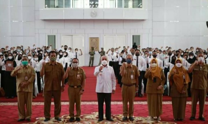 “Selamat atas ditetapkan dan diterima SK sebagai guru P3K di lingkungan Pemprov Kaltim. Semoga amanah dalam menjalankan tugas,” ucap Isran Noor ketika prosesi penyerahan SK P3K.