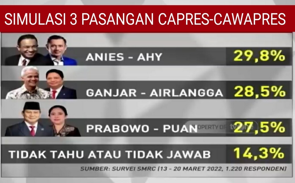 Duet tersebut berdasarkan simulasi 3 pasangan calon presiden dan calon wakil presiden. Hasil survai menunjukkan pasangan Anies-AHY mendapatkan 29,8 persen suara. Ganjar-Airlangga 28,5 persen. Prabowo-Puan 27,5 persen. Meskipun masih ada 14,3 persen yang belum menentukan pilihan