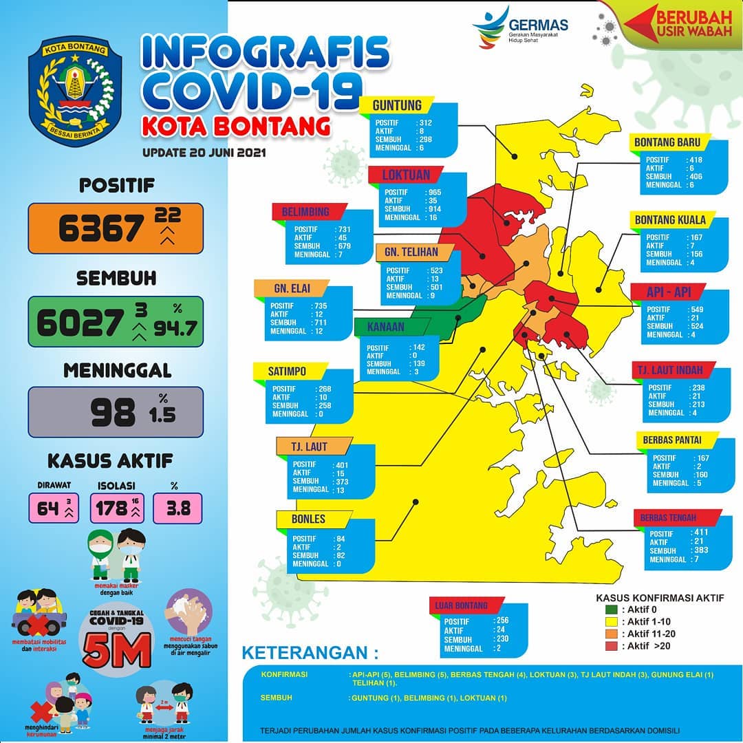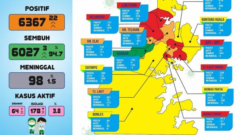 Di hari yang sama, satgas juga menyatakan ada 22 kasus terkonfirmasi baru. Terbanyak menyasar warga di Kelurahan Api-Api dan Belimbing. Masing-masing lima kasus. Total kasus aktif kini menjadi 242. Naik 19 kasus dibandingkan satu hari sebelumnya